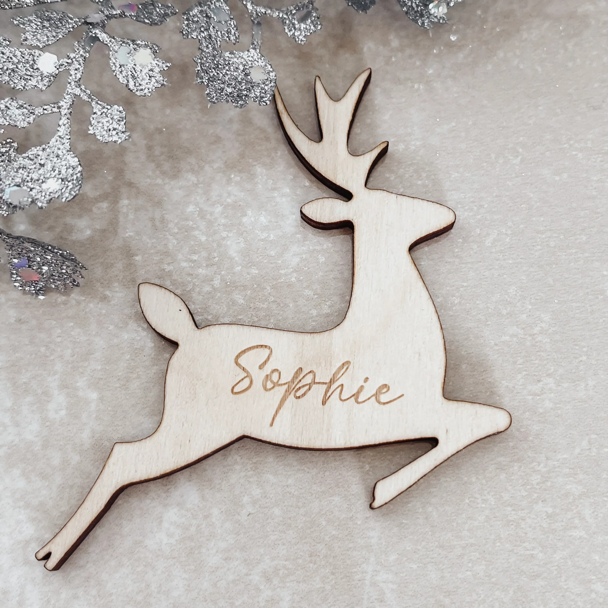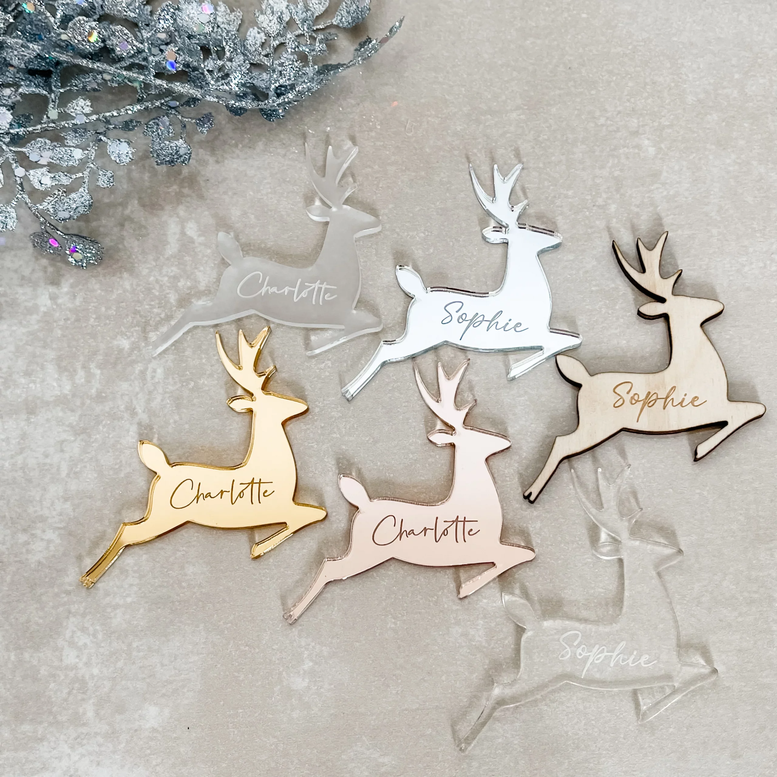 Bring a festive sparkle to your holiday wedding with our personalized Christmas reindeer place name cards. Select from 3mm acrylic, mirror acrylic, or natural plywood to match your décor. Engraved details appear especially striking against deeper tones, and each place card is individually crafted with your guests’ names for an elegant, memorable touch to your celebration or special event.