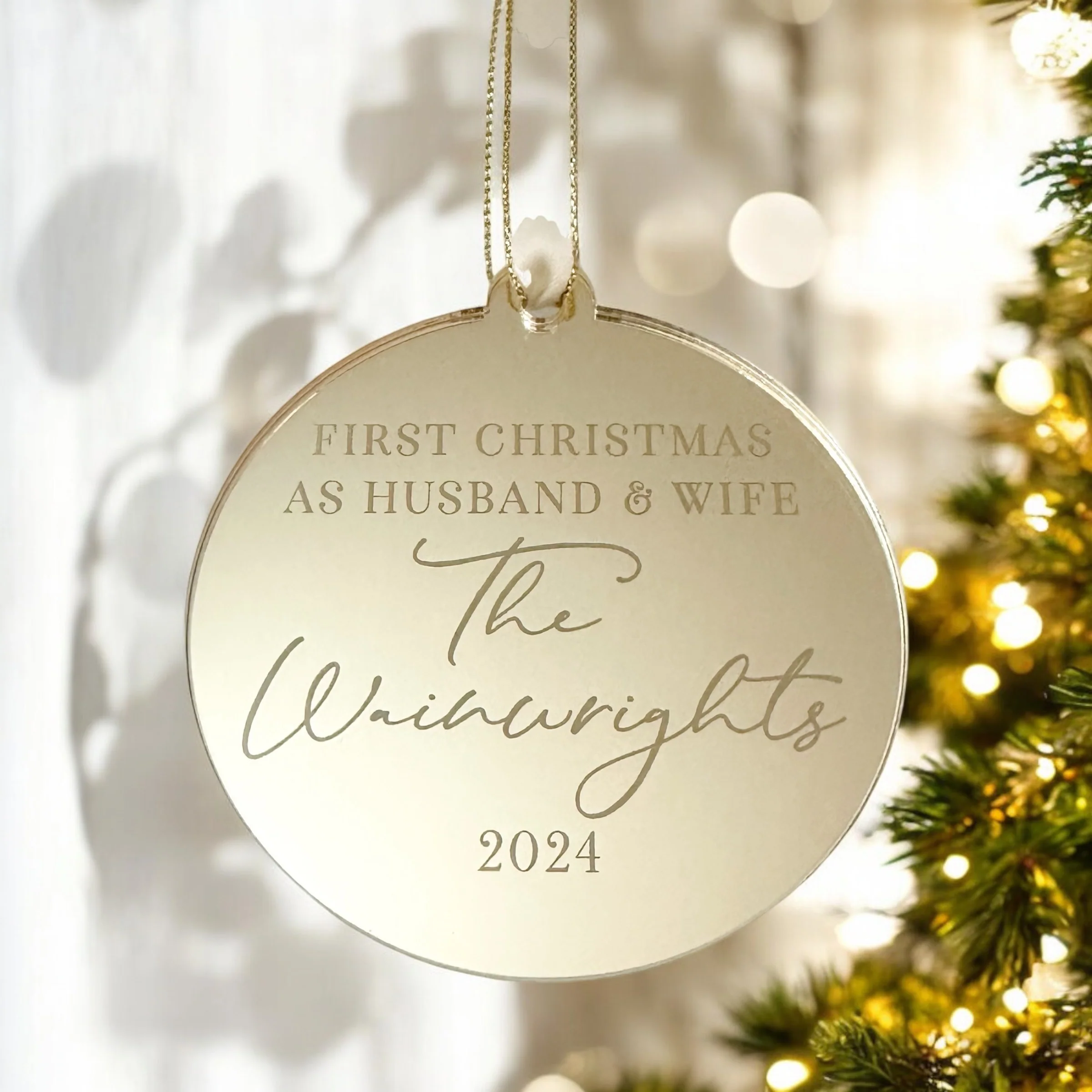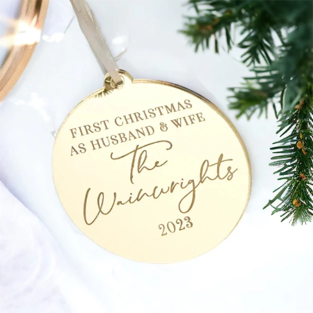 Celebrate your first Christmas together as newlyweds with our exquisite “First Christmas as Husband and Wife” ornament. Choose from a range of stunning finishes, available in 6cm, 8cm, or 10cm sizes, all crafted from high-quality 3mm acrylic. Every bauble includes a simple yet elegant grey ribbon, supplied separately, making it a charming enhancement to your holiday decorations.