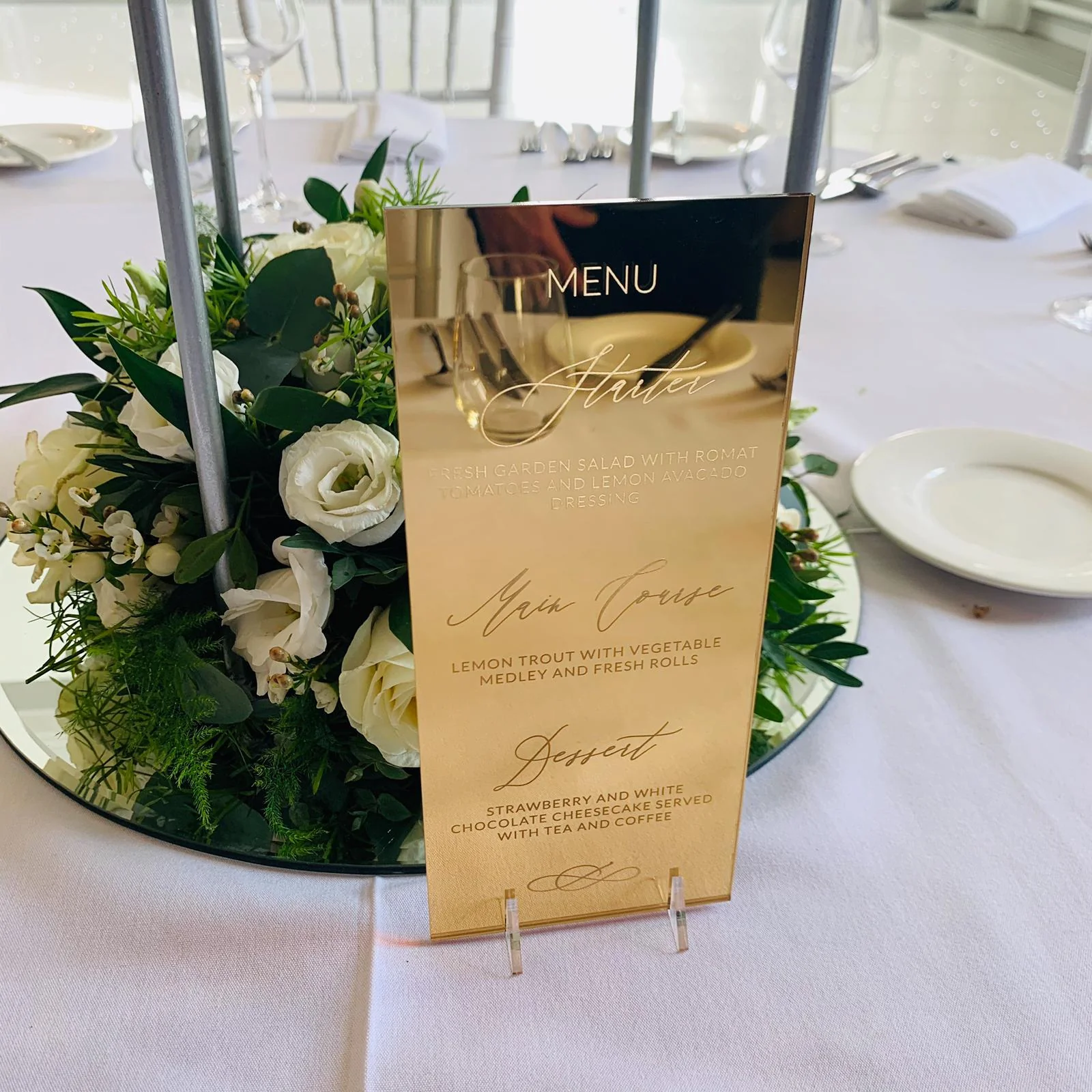 Elevate your dining space with our bespoke DL-sized menu, exquisitely engraved on a mirror-finish surface. Measuring about 95mm x 220mm (3.74 x 8.66 inches), each menu is available in a selection of elegant finishes to suit your style. Please note that a deeper background will enhance the visibility of the intricate engraving. Each menu is custom-made to your requirements and comes complete with stylish feet for a striking display.