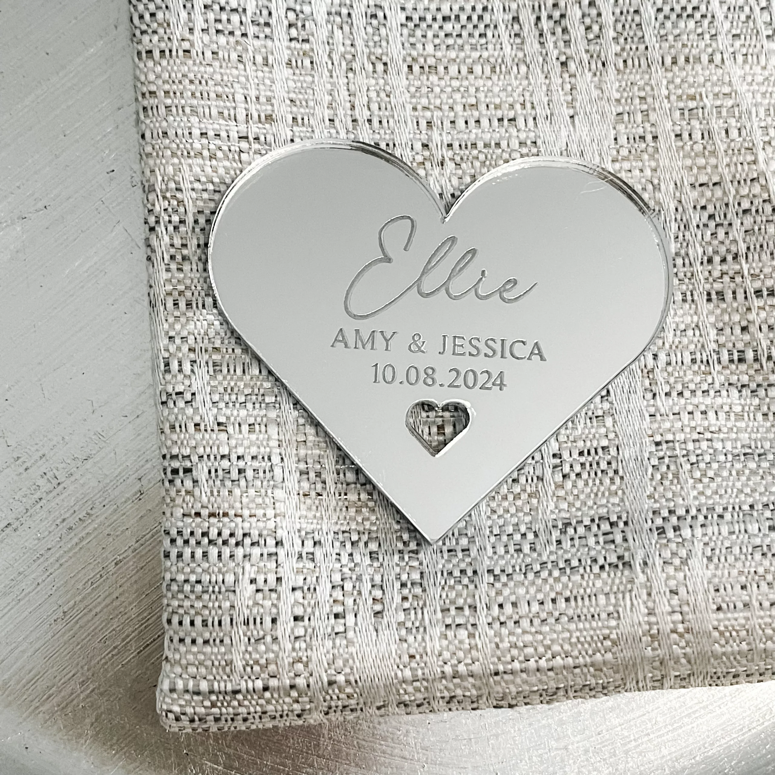 Add a touch of sophistication to your wedding celebration with our personalized heart-engraved place cards. Each name tag is individually crafted based on your preferences, with an array of premium materials to select from. One variant is extremely popular; however, to enhance the visibility of the engraving, we recommend displaying it against a darker background. Complete your table decor by choosing from our elegant collection of luxurious fonts.